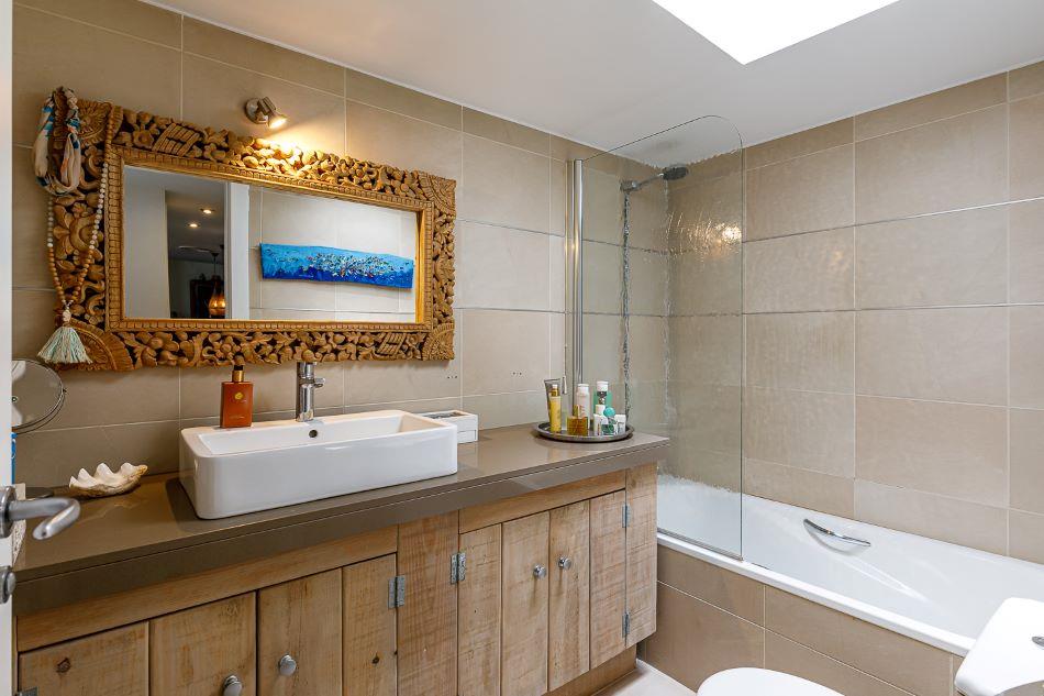 - cuarto de baño en suite con lavabo, ducha, water y secadora de pelo