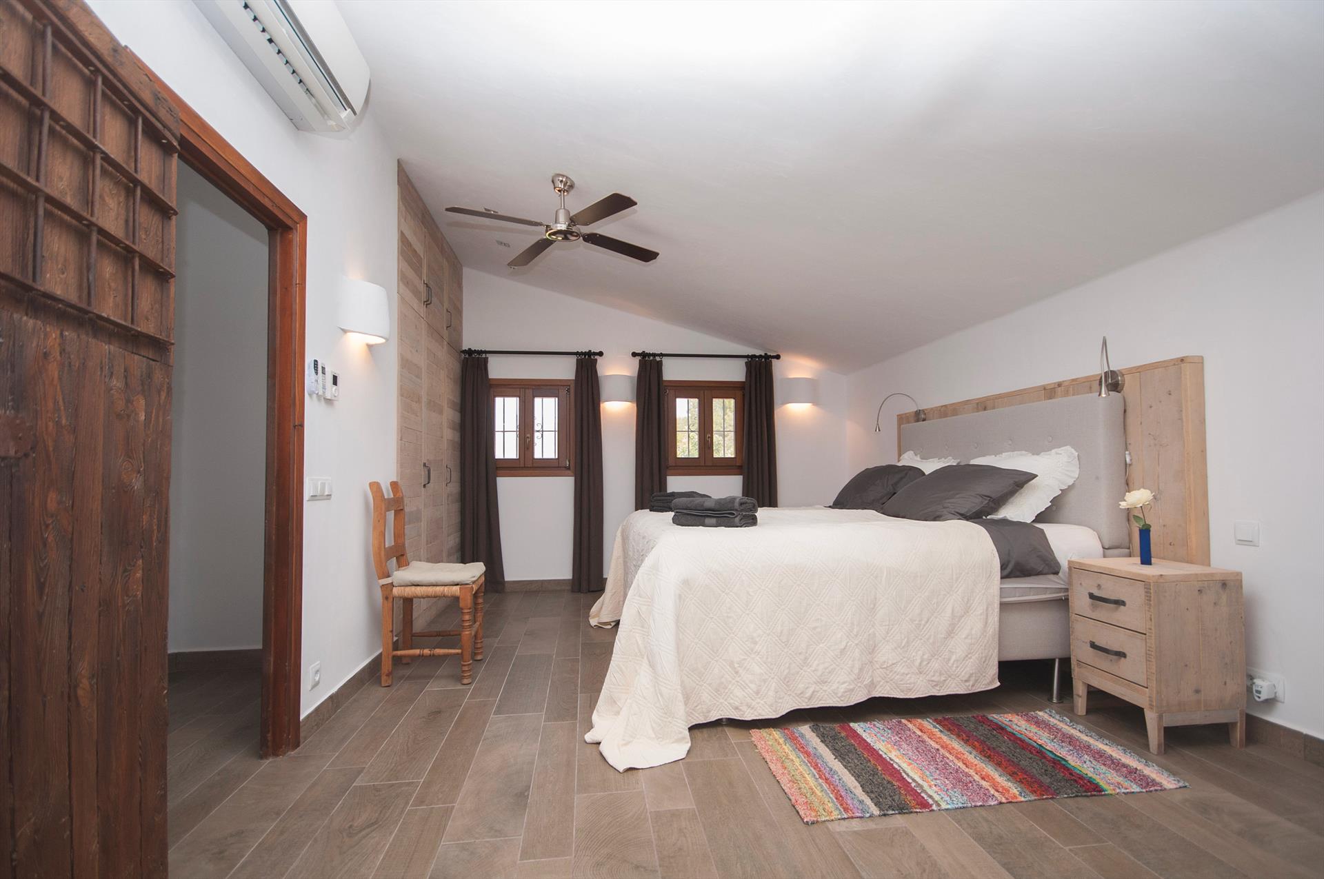 • dormitorio con cama doble, sofá cama y ventilador, aire acondicionado