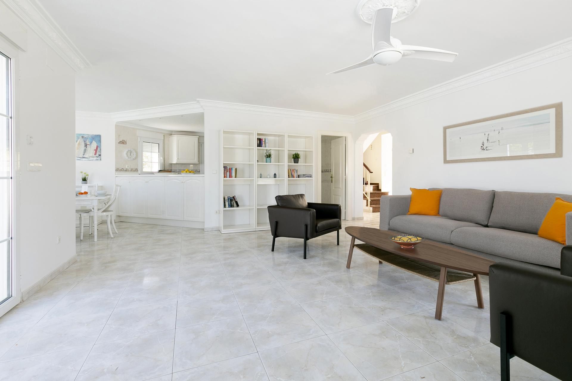 La villa cuenta con 4 dormitorios y 4 baños, distribuidos en 2 niveles. El alojamiento ofrece privacidad, un maravilloso jardín con césped, grava y árboles, una encantadora piscina y vistas impresionantes a las montañas. Su comodidad y la proximidad a la playa, áreas comerciales, actividades deportivas, instalaciones de entretenimiento y lugares de ocio hacen de esta una excelente villa para pasar sus vacaciones en España con familiares o amigos, e incluso con sus mascotas.