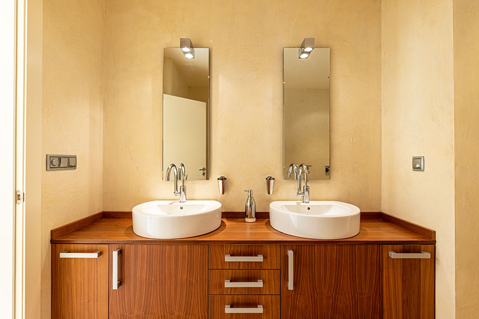 • Badezimmer mit Doppelwaschbecken, Badewanne, Dusche, Bidet und Toilette