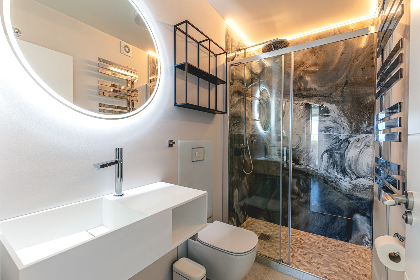 • Badezimmer mit Einzelwaschbecken, Dusche und Toilette