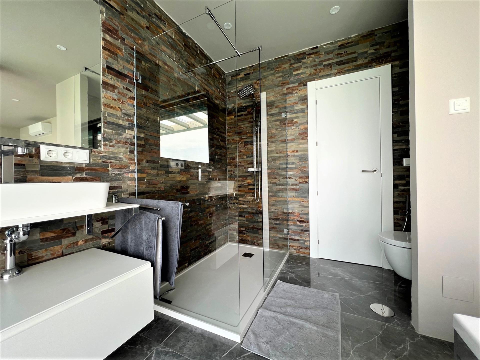 • Badezimmer mit Doppelwaschbecken, Dusche und Toilette