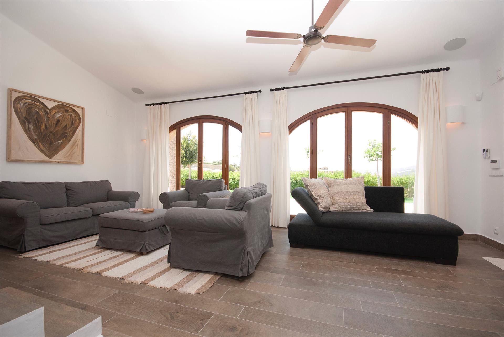 • Wohnzimmer mit Klimaanlage und offener Kamin, Fernsehen, Hi-Fi und Deckenventilator