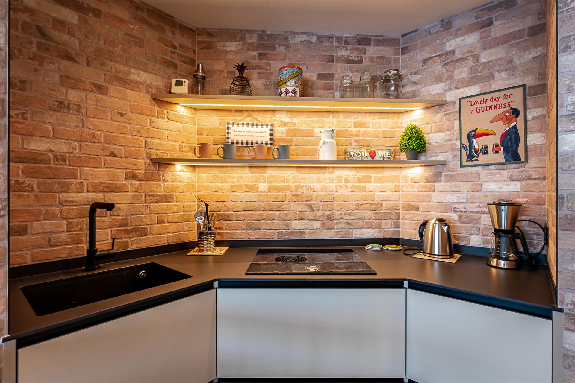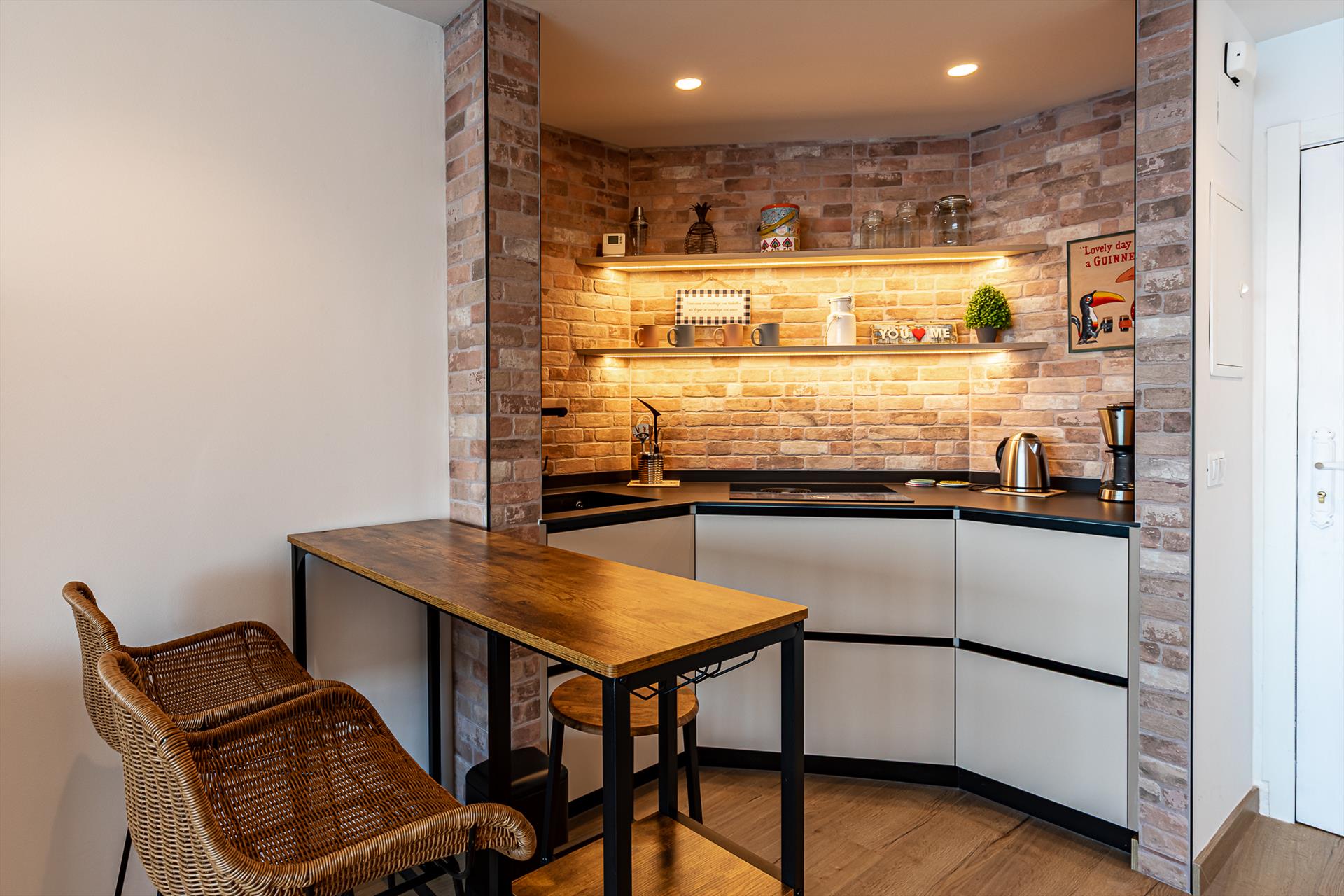 • open kitchen with gas hob, electric oven, refrigerator-freezer, coffee machine, mixer and toaster