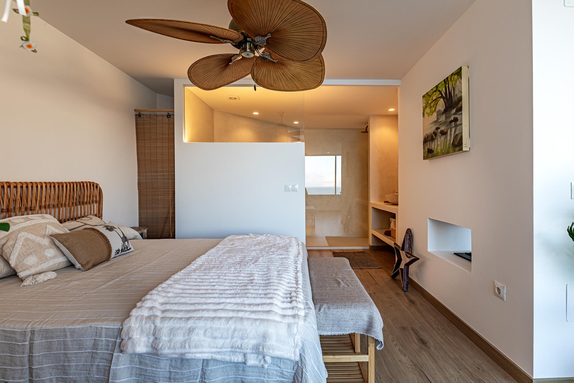 • bedroom with queen size bed (measuring 200 by 160cm), fan and bathroom en-suite
