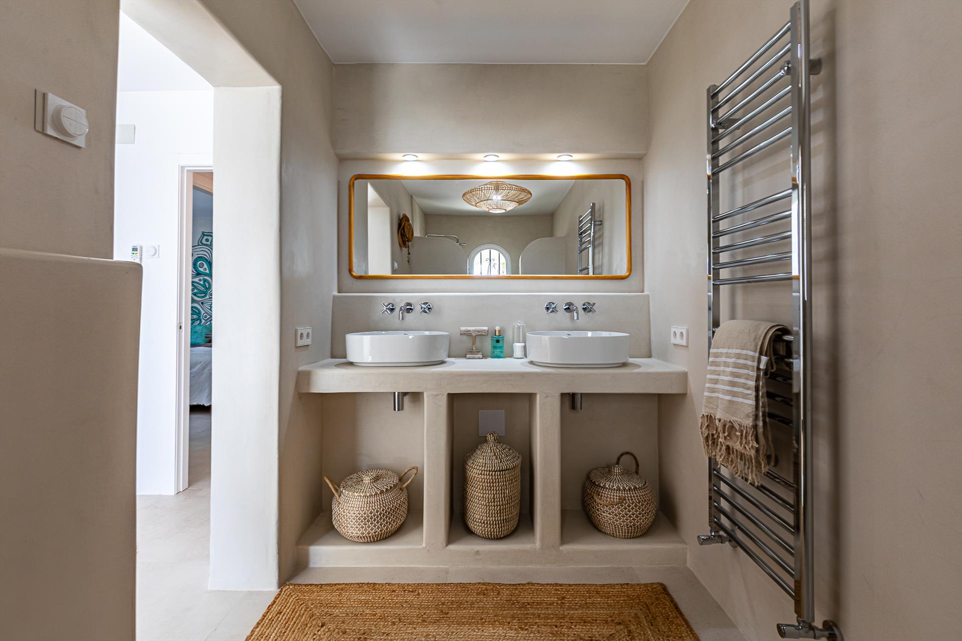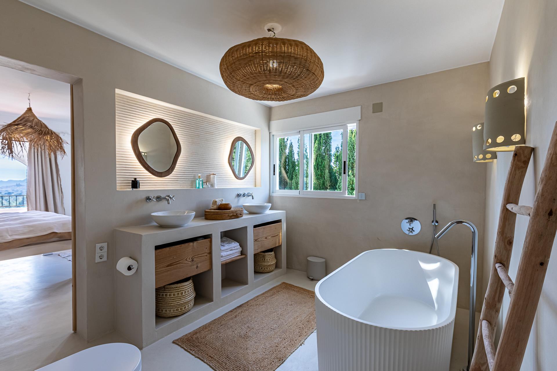 • en-suite bathroom with double washbasin, shower, and toilet