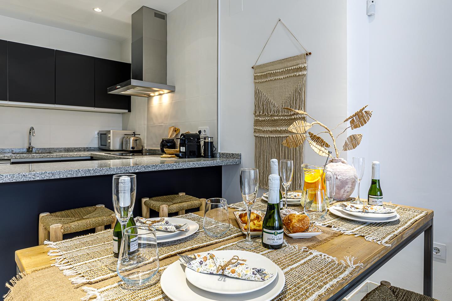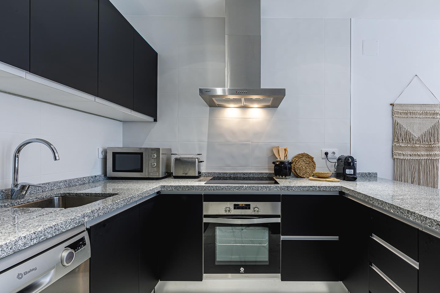 - open kitchen with electric hob, electric oven, microwave, dishwasher, refrigerator-freezer, coffee machine, toaster and juicer