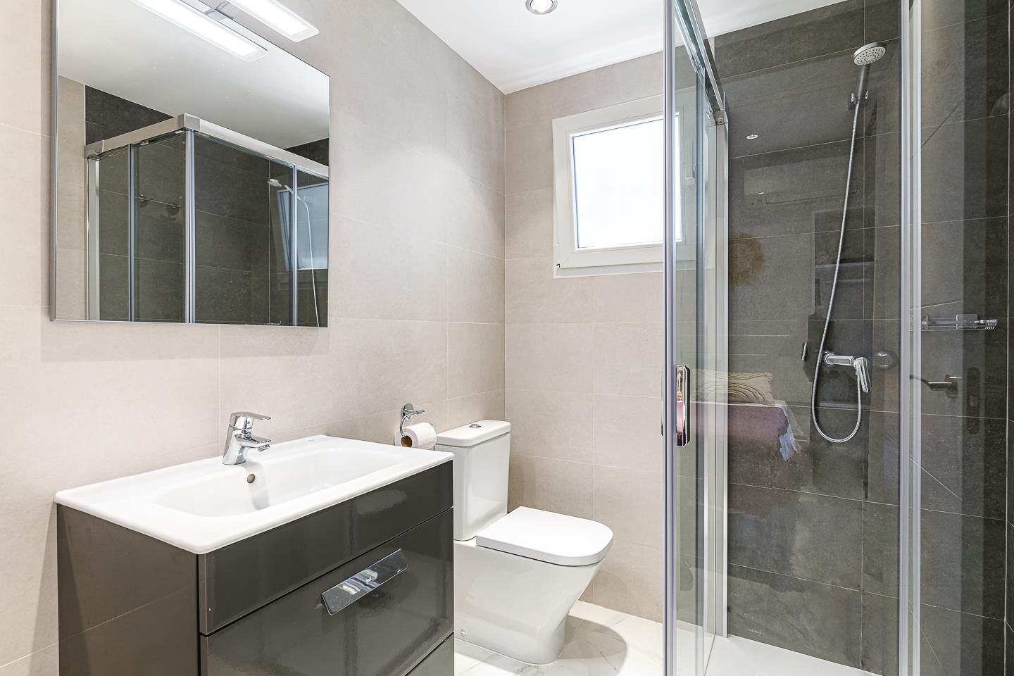 - bathroom with single washbasin, shower and toilet
