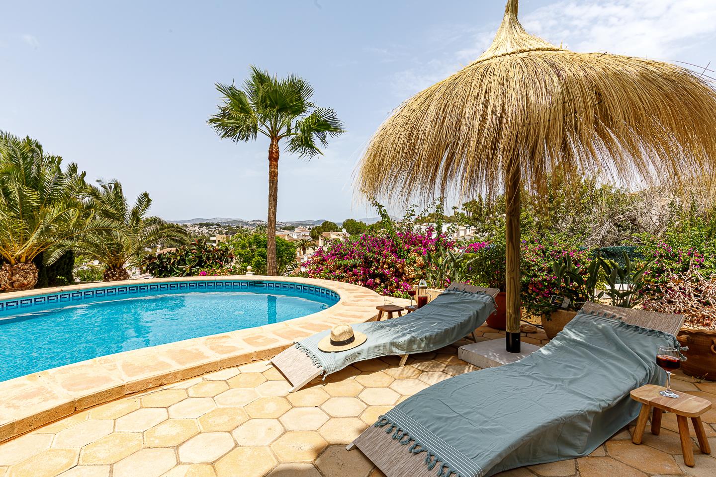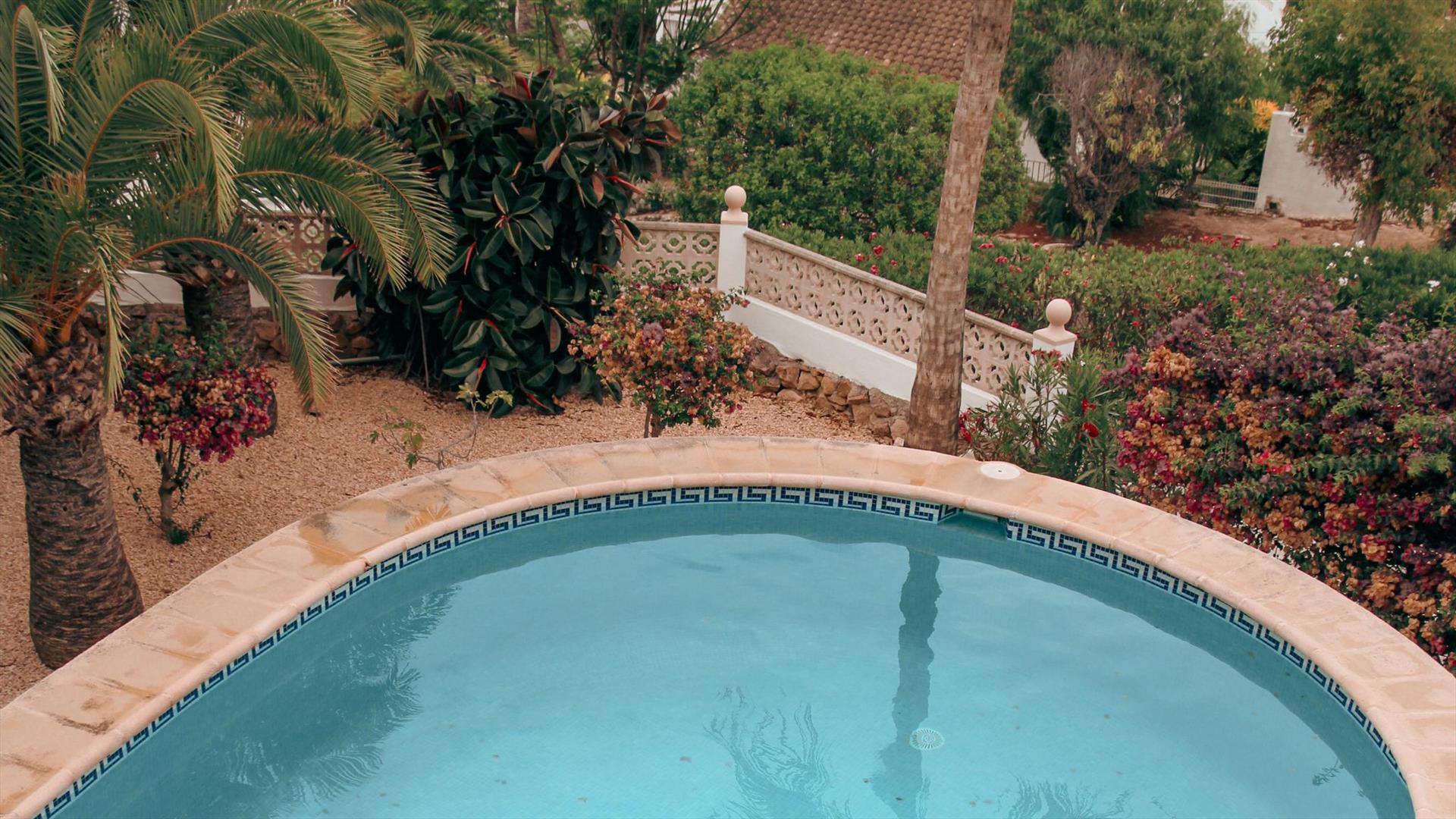 Just 1.1 km from Moraira's charming town center and less than 2 km from beautiful sandy beaches, Villa Bajo el Sol offers stunning views of the valley and mountains from the beautiful garden and pool area.