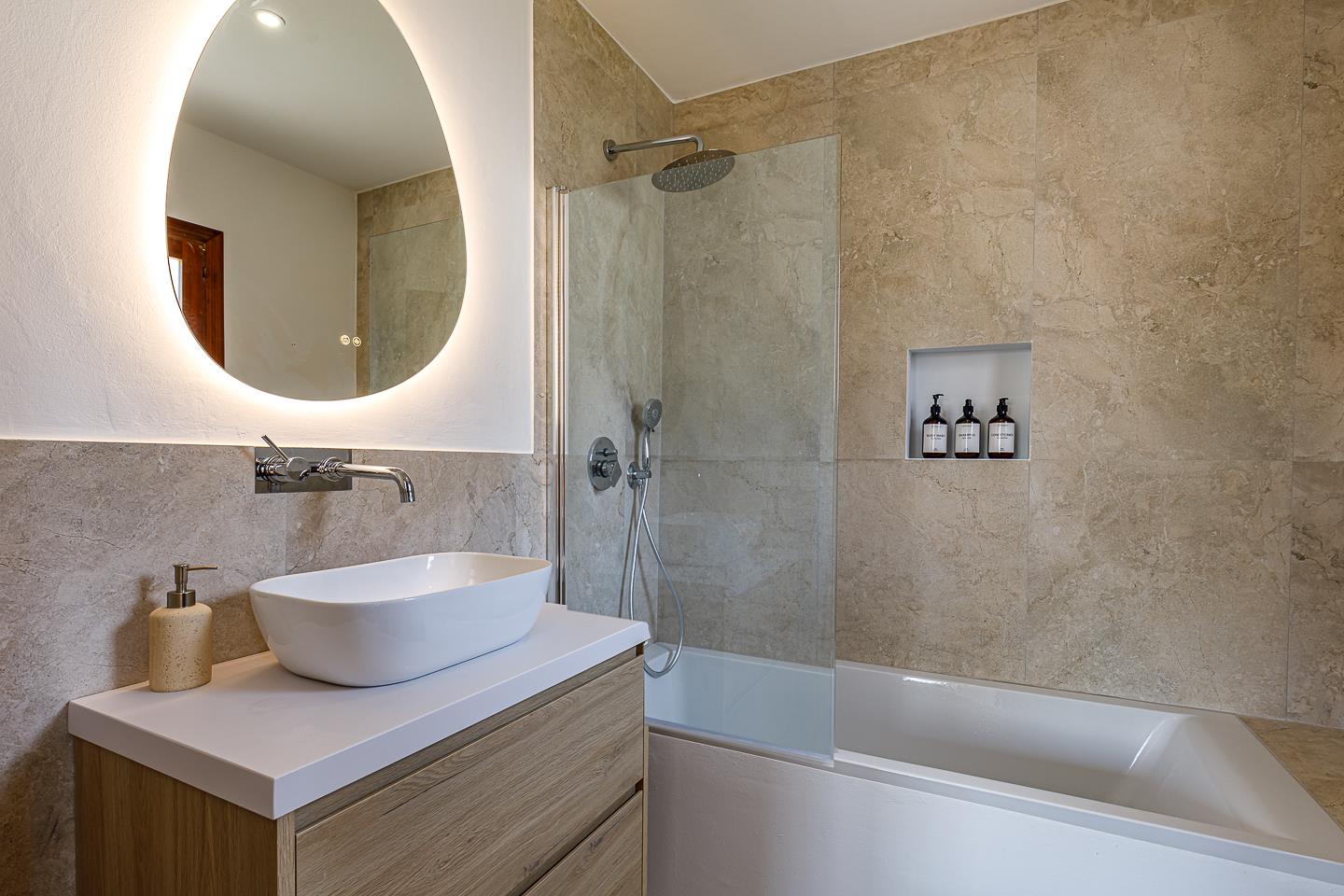 • En-suite bathroom with single washbasin, bath, shower, toilet and hairdryer