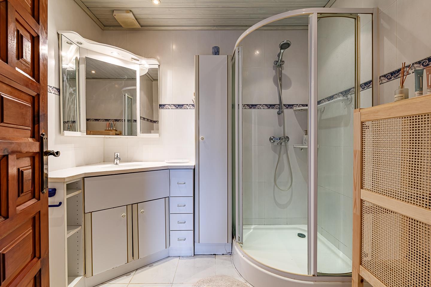- bathroom with single washbasin, shower, toilet, and hairdryer