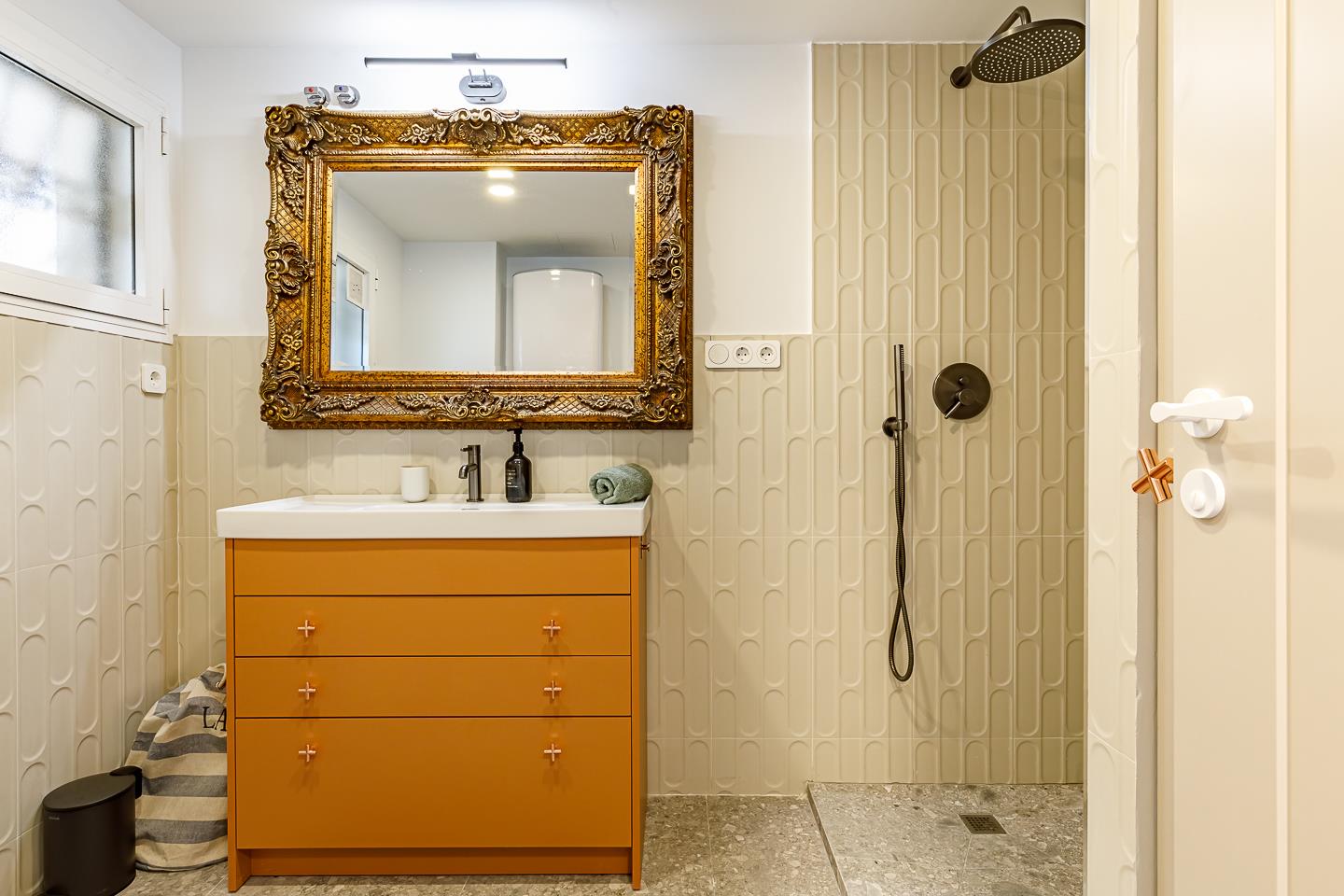 • salle de bains attenante avec lavabo simple, douche, toilettes et sèche-cheveux