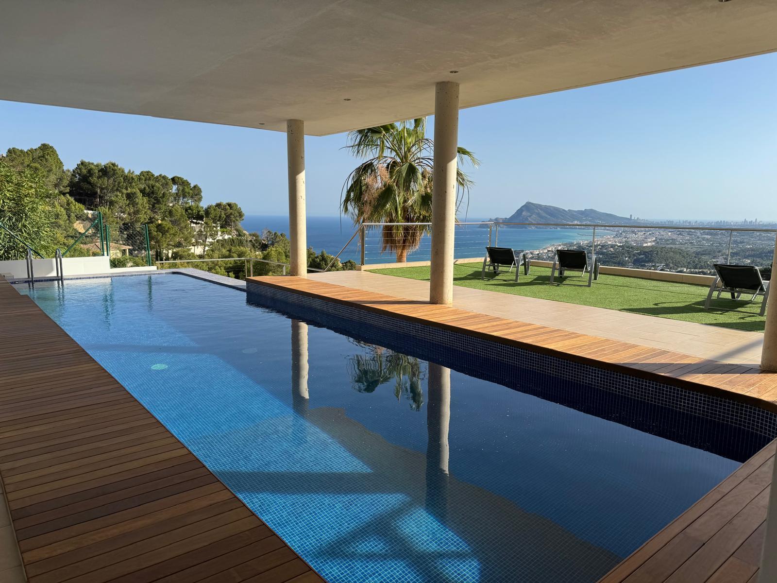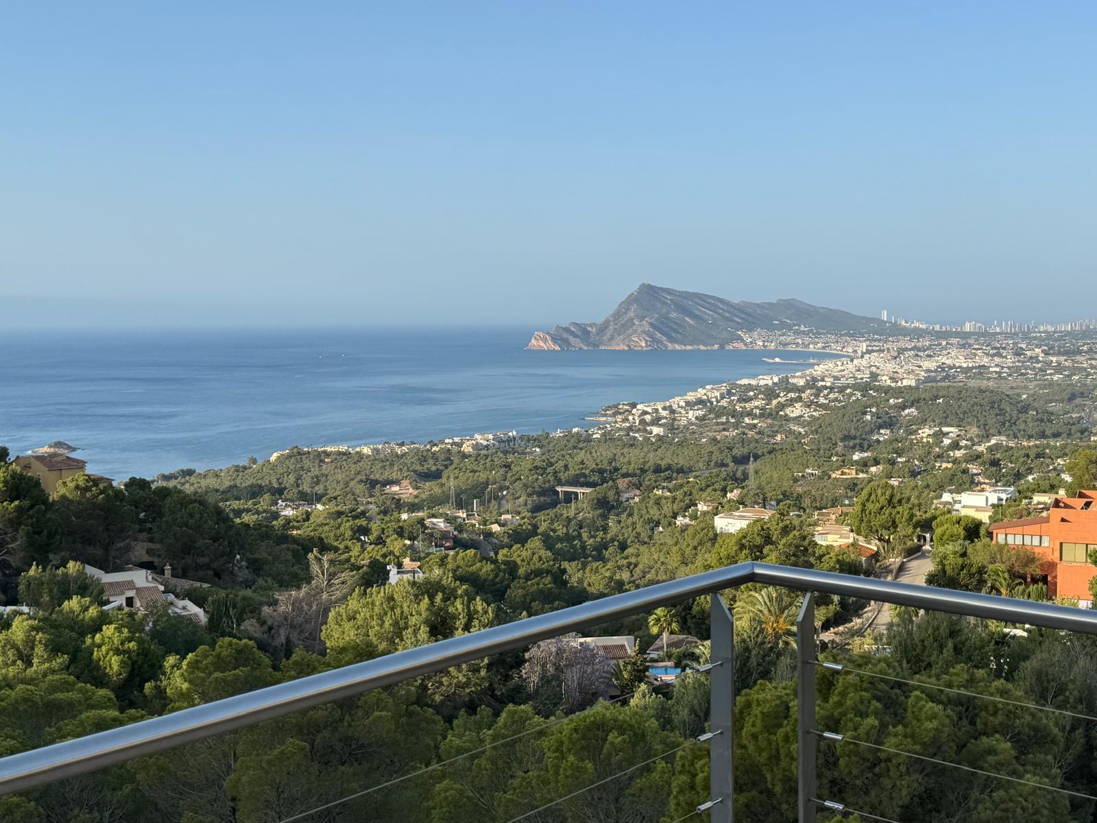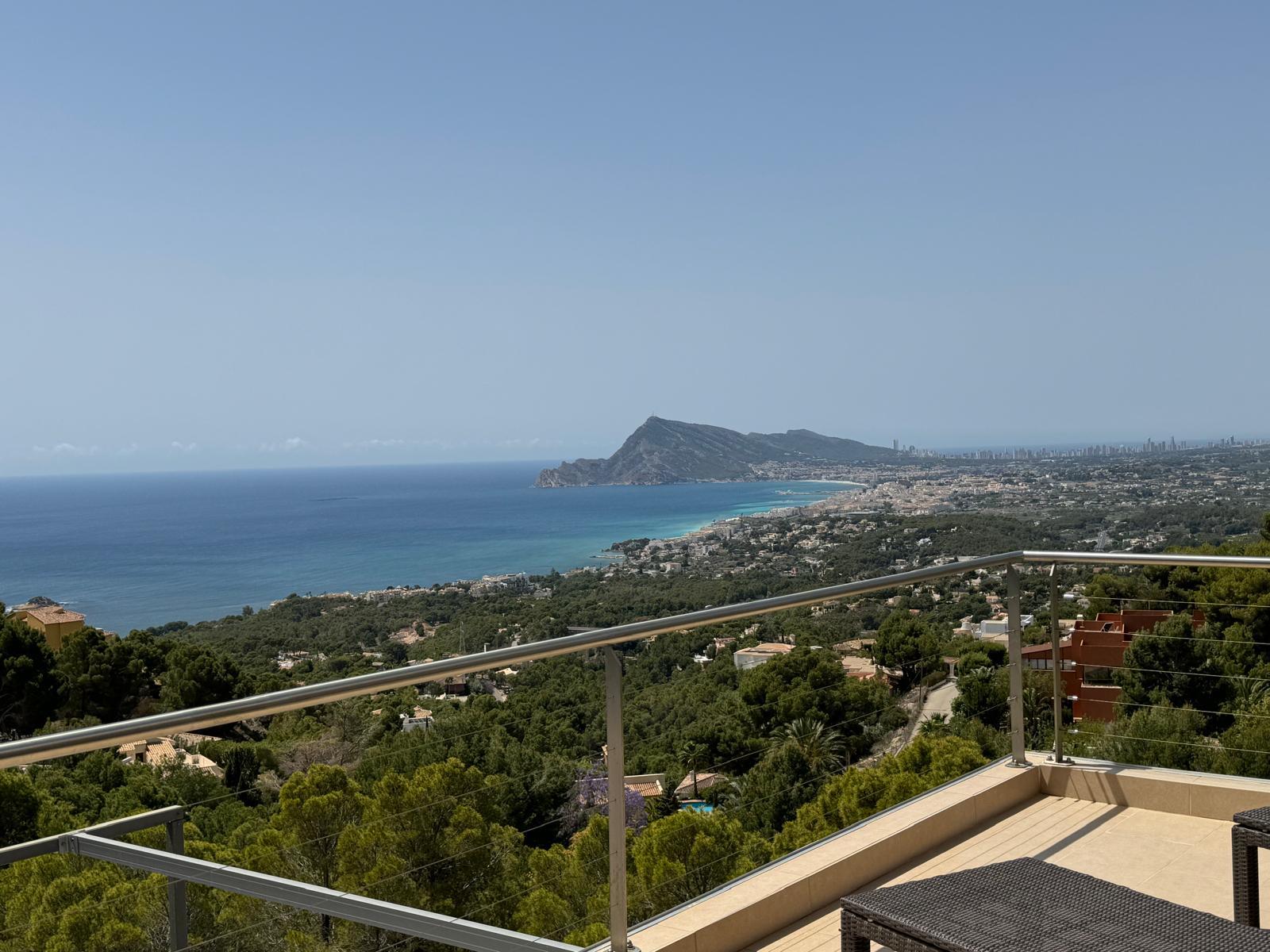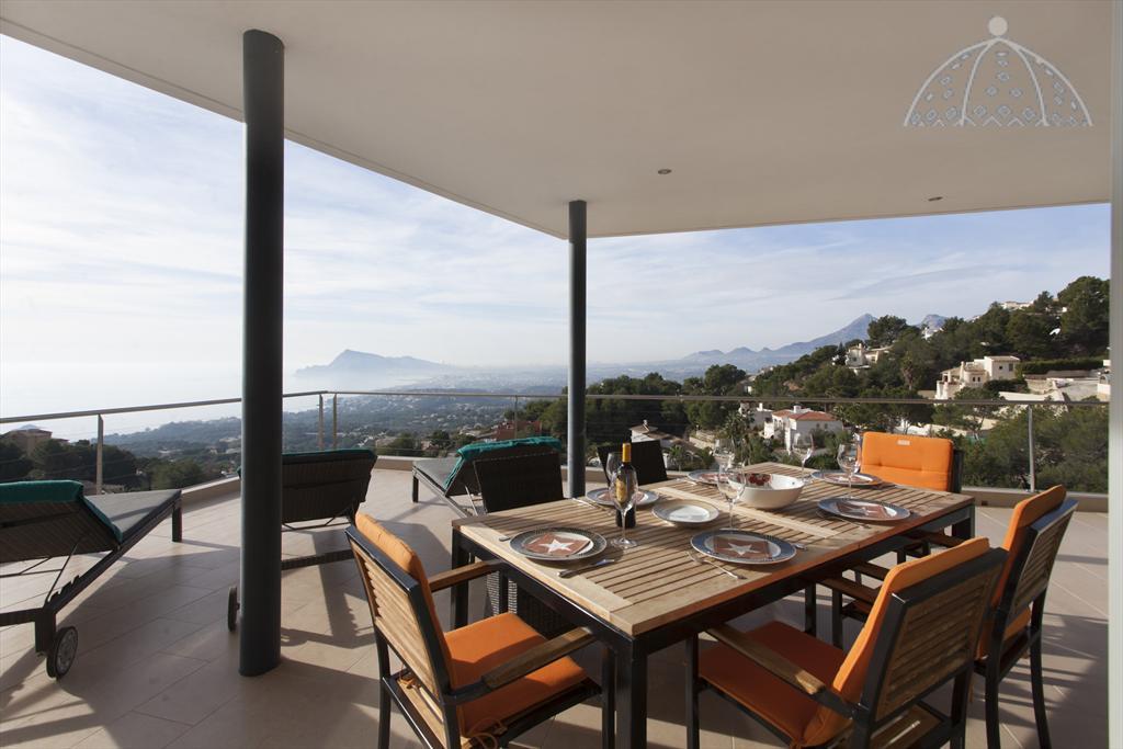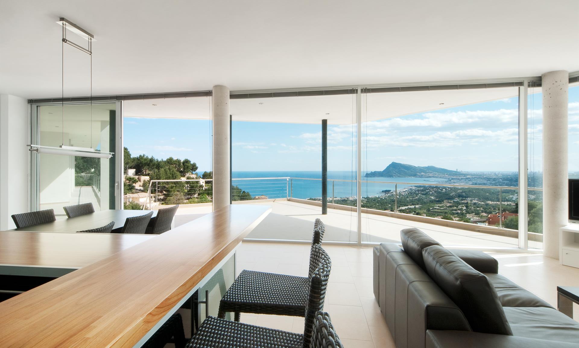 Moderne en luxe vakantiewoning met zeezicht  in Altea, aan de Costa Blanca, Spanje met privé zwembad voor 8 personen. De woning ligt in een heuvelachtige en residentiële omgeving en op 4 km van het strand van Altea Campomanes.