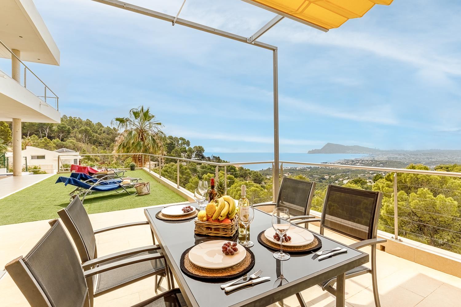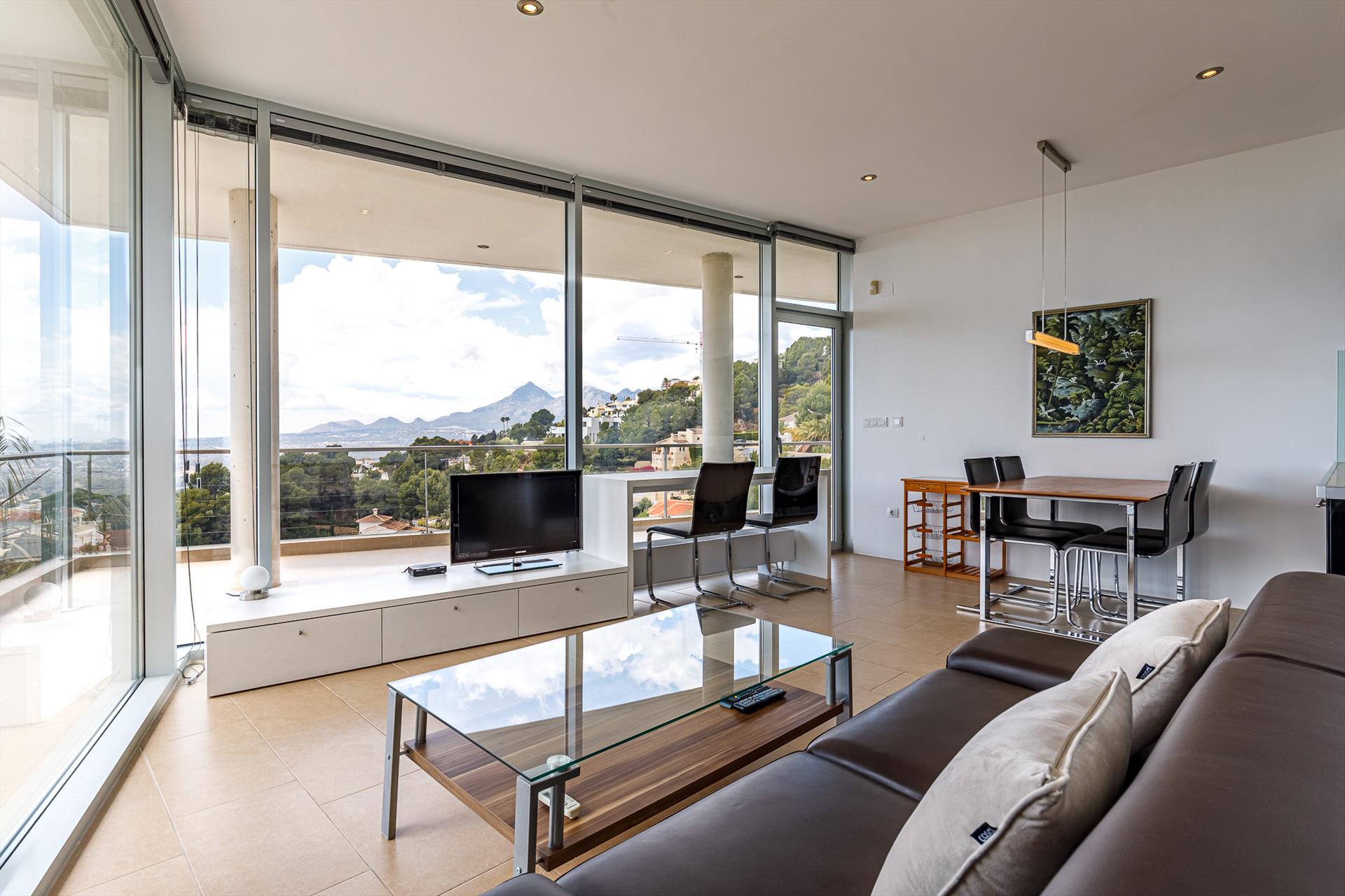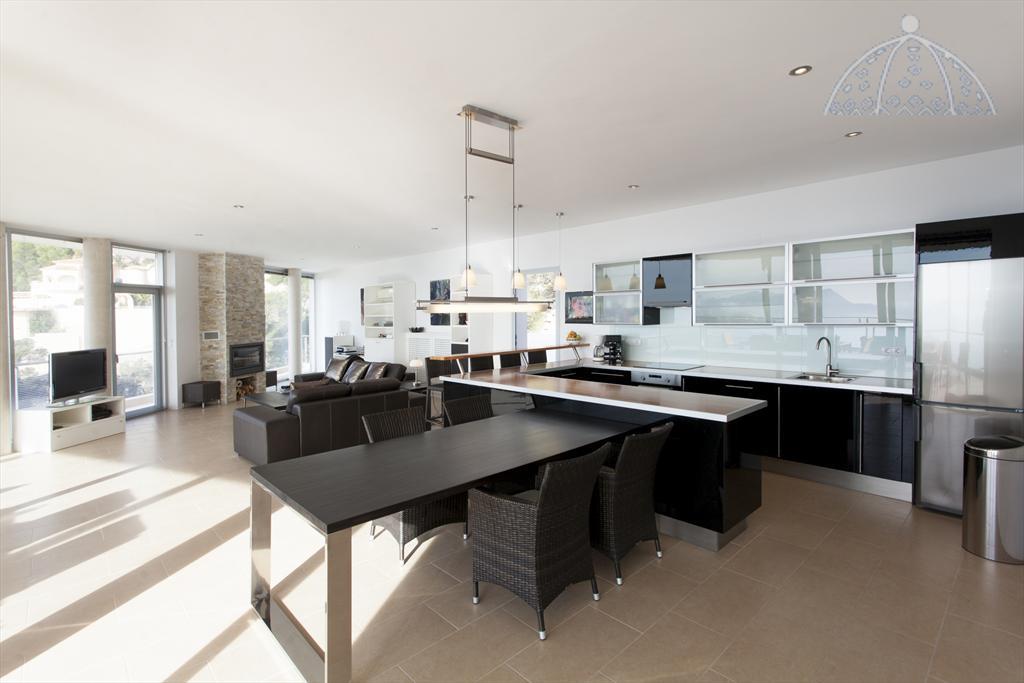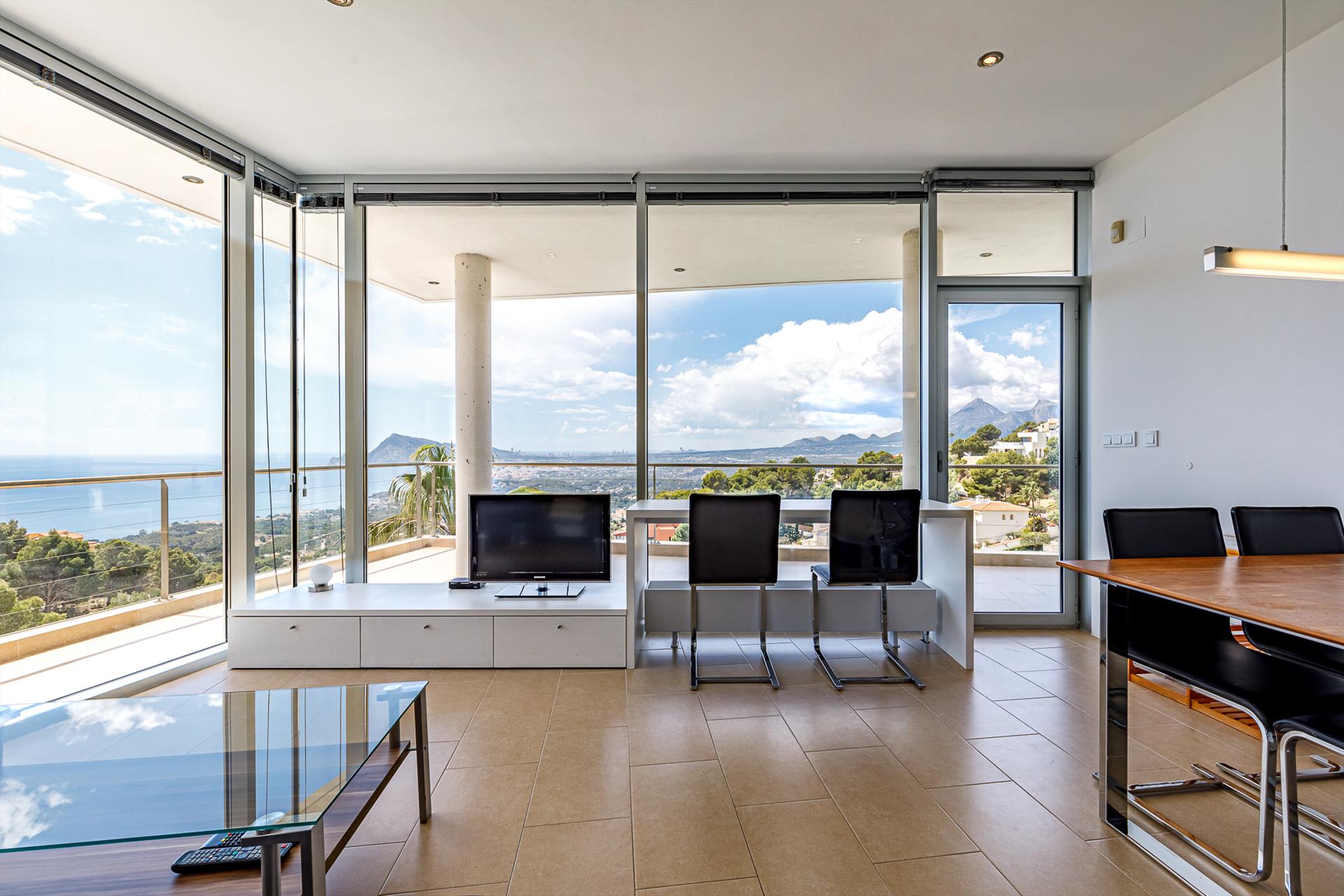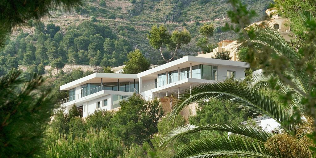 Moderne en luxe vakantiewoning met zeezicht  in Altea, aan de Costa Blanca, Spanje met privé zwembad voor 8 personen. De woning ligt in een heuvelachtige en residentiële omgeving en op 4 km van het strand van Altea Campomanes.