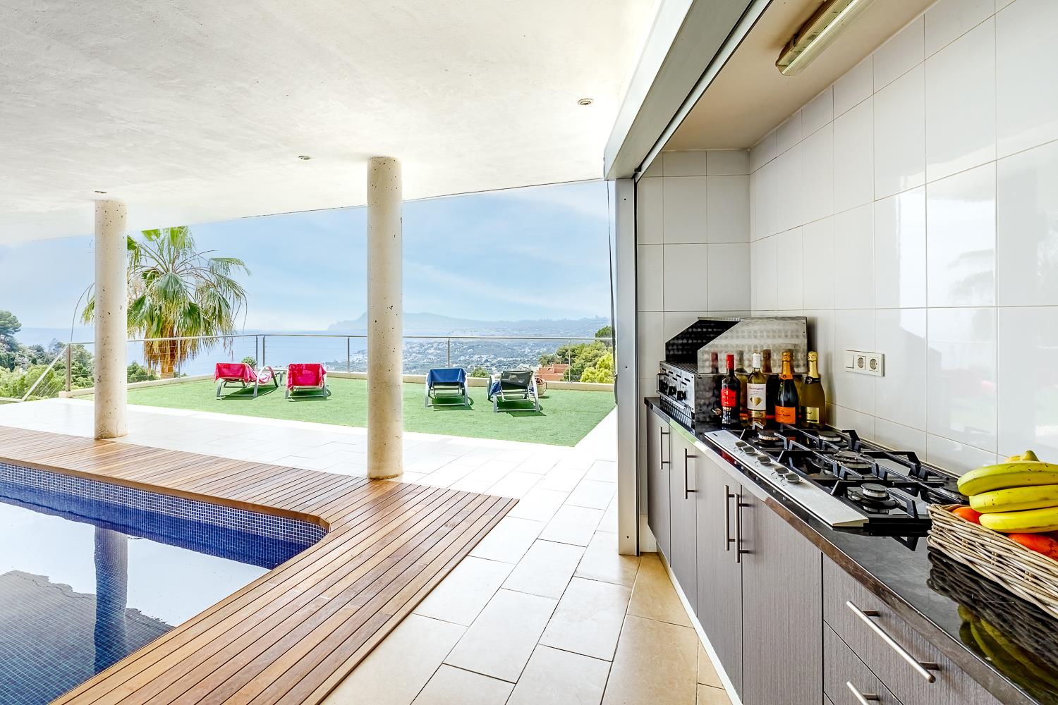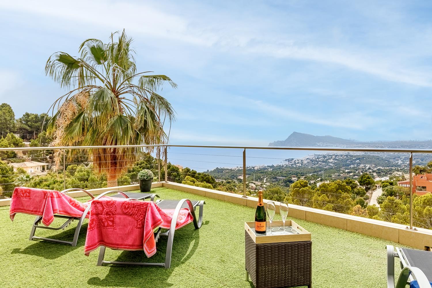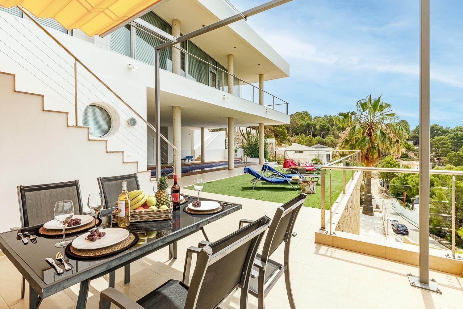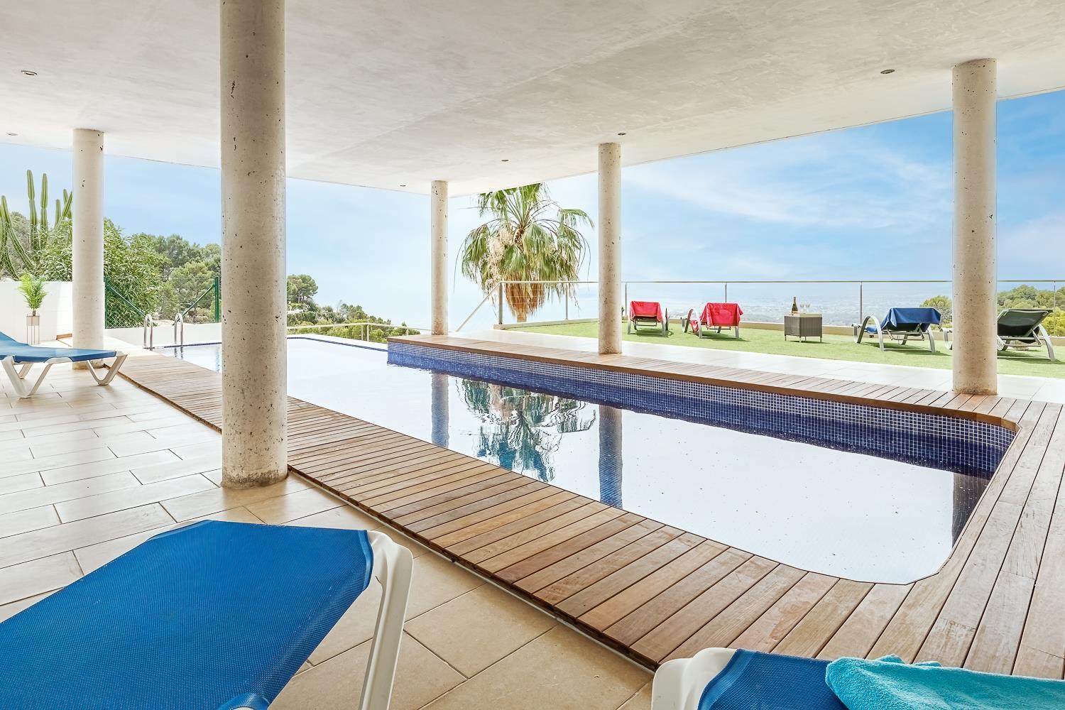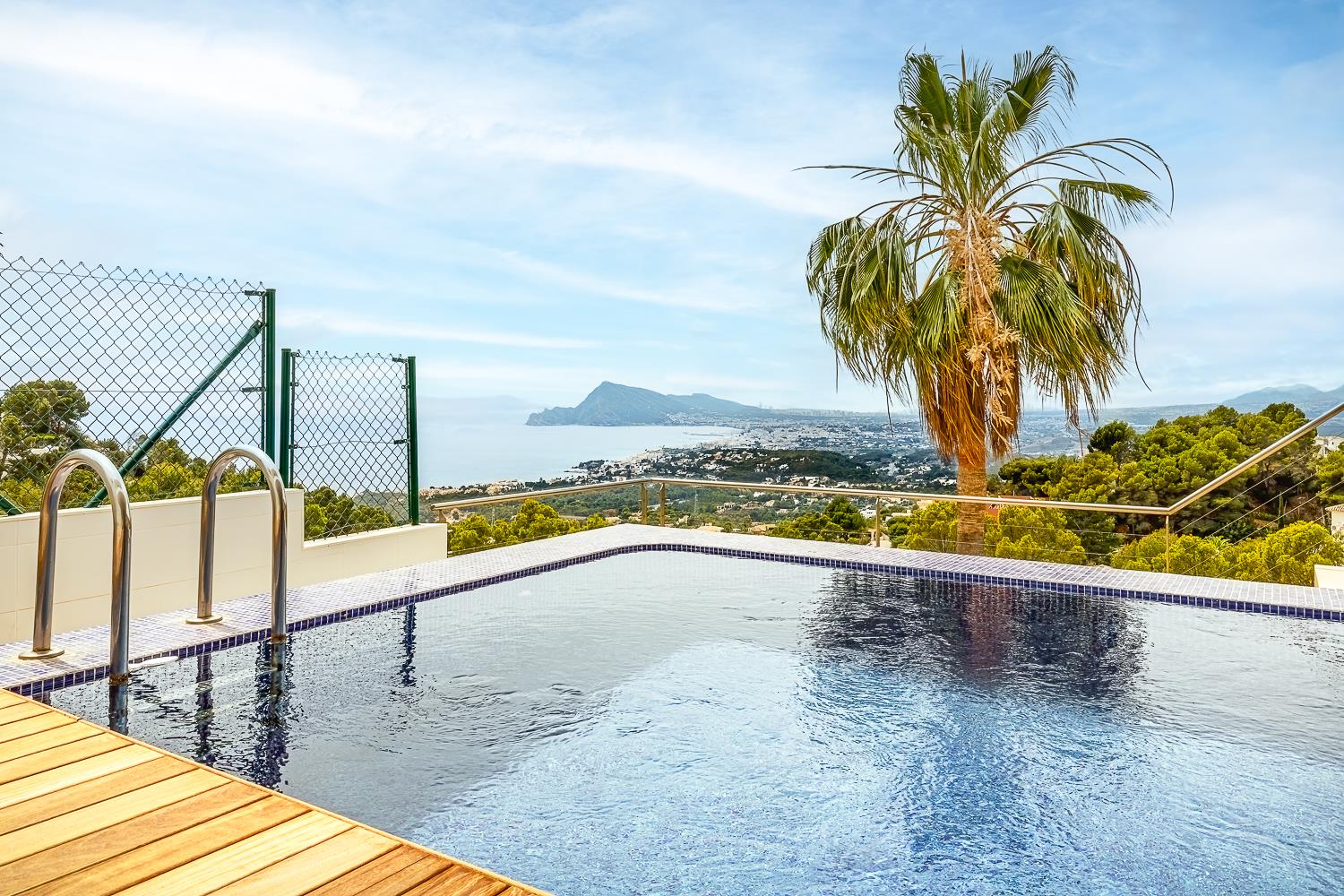 Moderne en luxe vakantiewoning met zeezicht  in Altea, aan de Costa Blanca, Spanje met privé zwembad voor 8 personen. De woning ligt in een heuvelachtige en residentiële omgeving en op 4 km van het strand van Altea Campomanes.