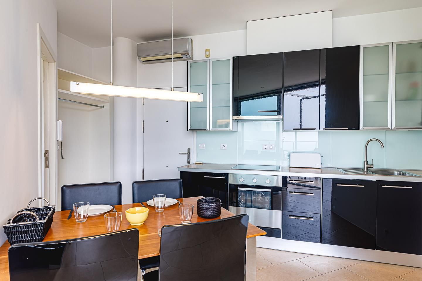 • open keuken met electrisch fornuis, electrische oven, magnetron, afwasmachine, koel-vriescombinatie, koffiezetapparaat, waterkoker, mixer en broodrooster
