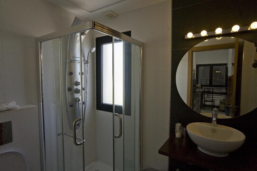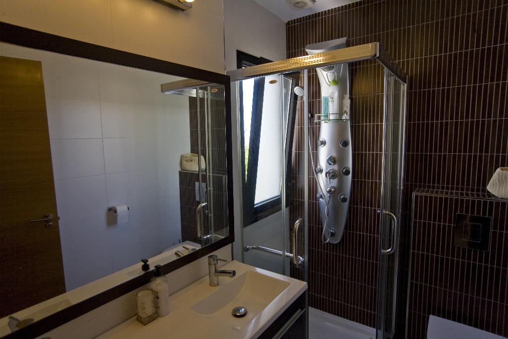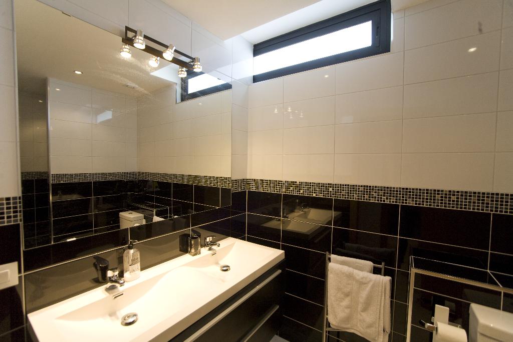 • badkamer en suite met dubbele wastafel, douche en toilet